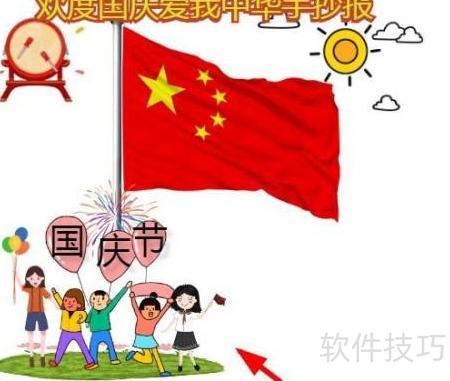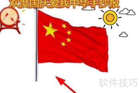 4、 国庆手抄报下方绘随风飘扬的红旗