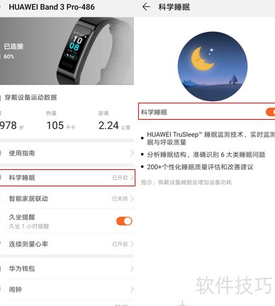 1、 将华为手环3/3 Pro与运动健康App配对后,需进入App设备管理页面,开启科学睡眠功能。
