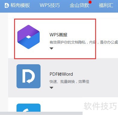 3、 打开WPS软件,进入我的WPS选择应用,点击WPS画报即可。