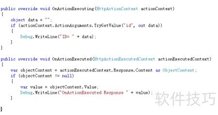 7、 通过 actionContext.ActionArguments 获取参数,或调用 TryGetValue 方法尝试从中提取键为 id 的值并赋给 data 变量。该操作可用于判断参数是否存在并安全获取其内容,避免因键不存在而引发异常,适用于需要处理可选参数或动态传参的场景。
