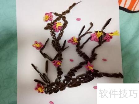 9、 在梅——衍纸DIY作品上点缀几片梅花瓣,整体效果更显美观自然,生动逼真。大家喜欢这样的设计吗?可根据个人喜好自由调整花瓣的位置与数量,打造独特风格。