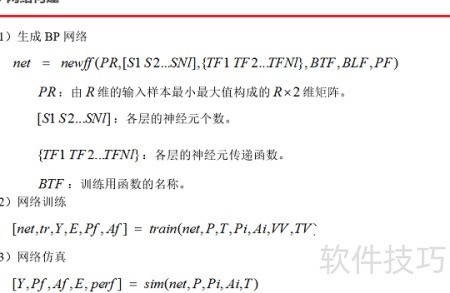 3、 接下来通过具体实例说明BP神经网络的应用方法。在MATLAB命令行中,首先设定输入数据P和目标输出T,然后利用newff(minmax(P), , {tansig,purelin}, trainrp)语句建立一个包含输入层、隐含层和输出层的BP网络结构。接着使用net = train(net, P, T)对网络进行训练,使其学习输入与输出之间的映射关系。训练完成后,调用sim(net, P)对数据进行仿真,获取网络的预测结果。整个过程涵盖了数据准备、网络构建、训练优化与结果预测,完整代码实现清晰直观,便于理解和应用。