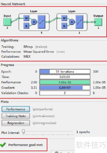 4、 在命令行窗口按下回车键后,会弹出结果窗口。窗口顶部Neural Network下方依次显示网络结构的组成部分:输入层、隐含层、输出层、输出。其中,隐含层包含五个神经元。进度区域中的Epoch表示训练的迭代次数,Gradient为当前梯度值,Validation Checks用于指示验证检查的执行情况。当训练达到预设性能目标时,界面末尾将显示绿色对勾标志,表明模型训练成功完成,各项指标符合要求,所示。