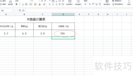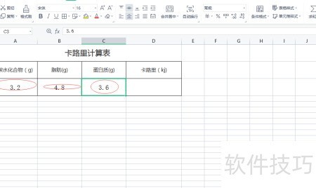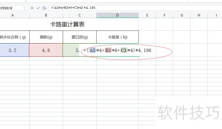 3、 在卡路里栏输入公式=(A3×4+B3×9+C3×4)×4.186。