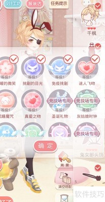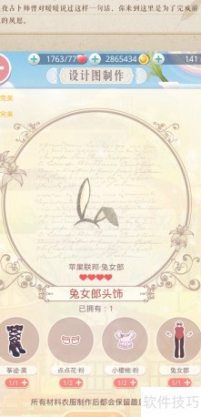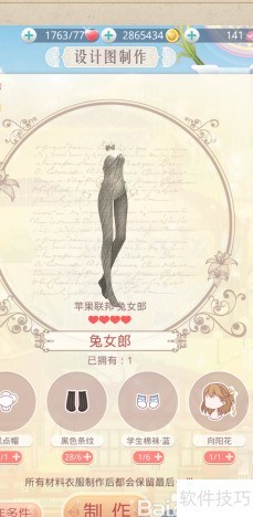 4、 制作兔女郎头饰需先准备两套筝迹服装,点击角色下方加号即可查看,这两套可通过服装店购买;点点花的两件服饰同样可在少女级关卡获取或于商店购得;小樱桃的情况也类似。当兔女郎服饰齐备后,点击制作按钮,即可完成兔女郎头饰的制作。