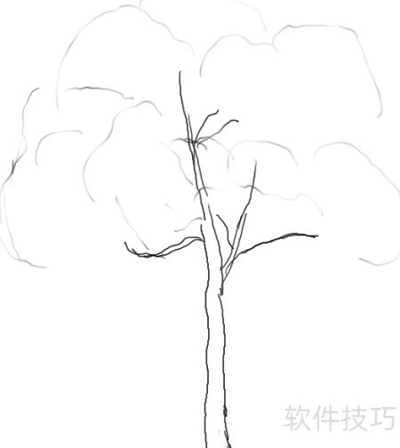 2、 用浅色铅笔勾勒树冠轮廓,将其划分为约八个半球形区域,每个区域代表一簇受光呈现立体感的树叶。