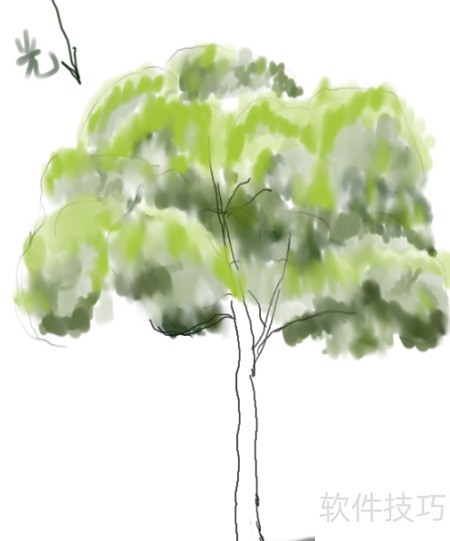 5、 选用最亮色作为画笔,用涂抹工具均匀上色,提亮树叶丛的高光部分,同时对阴影区域进行细致涂抹。