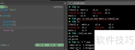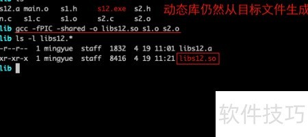 10、 利用前一步通过gcc -c s1.c s2.c生成的s1.o和s2.o目标文件,运行命令gcc -fPIC -shared -o libs12.so s1.o s2.o,即可生成名为libs12.so的动态链接库文件。