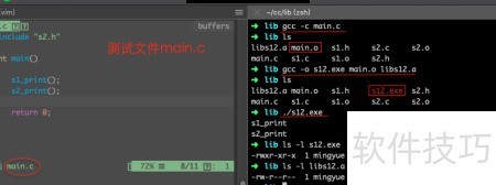 5、 编写测试文件main.c,编译并链接静态库libs12.a进行功能验证。
