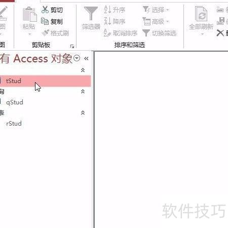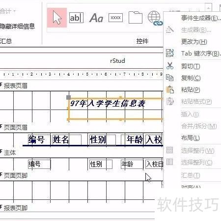 2、 选中报表rStud,右键点击进入设计视图。