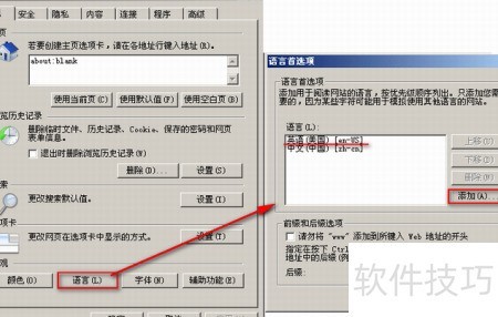 13、 以IE浏览器为例,进入工具栏中的工具菜单,选择Internet选项。在弹出的窗口中点击语言按钮,随后打开语言设置界面。点击添加按钮,在列表中选择英语(美国),确认后将其添加至语言列表。接着在语言列表中选中英语(美国),通过上移按钮将其调整至列表顶部。当该语言位于首位时,浏览器即默认使用英语(美国)作为首选语言,完成设置后点击确定保存更改即可。