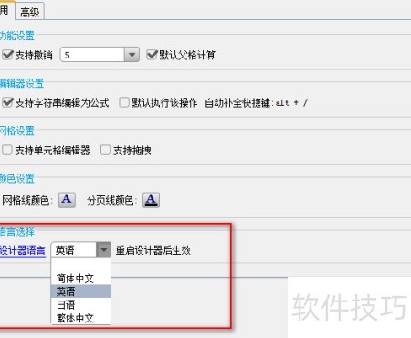 8、 在弹出的对话框中找到语言选项,将设计器语言:简体中文更改为英语。