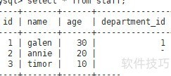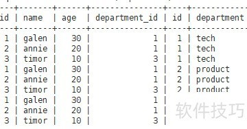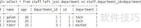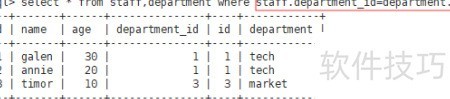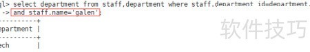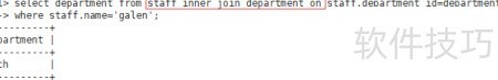 10、 从员工表与部门表进行内连接,条件为员工表中的部门编号等于部门表的编号,筛选出姓名为galen的员工所在部门信息,最终查询结果显示其所属部门字段内容。