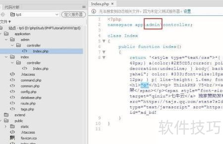 1、 application文件夹用于存放开发者编写的各类代码文件,如页面、控制器等。TP5框架初始运行时显示的欢迎页面即位于该目录下,其具体路径为application/index/controller/Index.php,该文件是项目默认首页的核心控制文件。