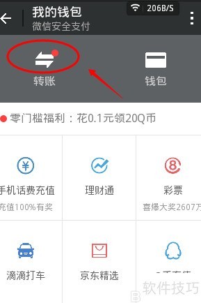 3、 打开钱包页面,点击左上角的转账按钮即可进行操作。