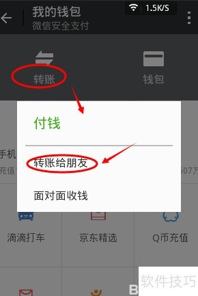 4、 点击后出现下拉菜单,选择转账给朋友,选定好友并输入金额,最后点击转账按钮即可完成操作。