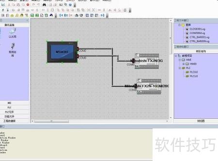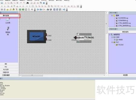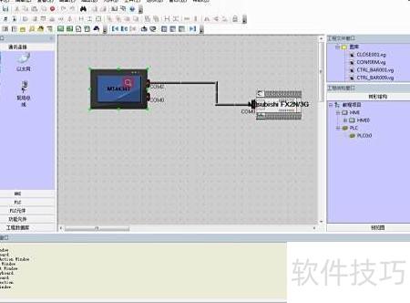 4、 接下来需连接所选设备,将选项切换至通信连接,选择所需连接方式并拖入工作区,再将HMI与PLC拖动至相应位置完成连接。