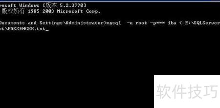 5、 在命令行中输入 mysql -u root -p* iba < E:SQLServercountPASSENGER.txt,执行该指令可从指定路径导入SQL文件到数据库。