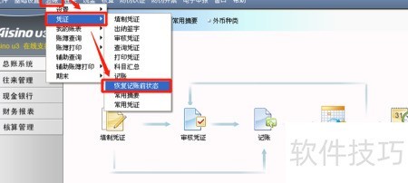 在Aisino U3总账系统中,若已记账的凭证需撤销,可按以下步骤进行取消记账操作。