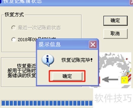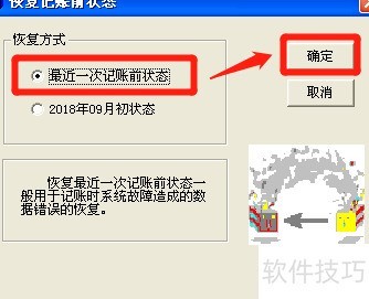 3、 系统提示恢复记账前状态功能已启用,确认后继续操作。