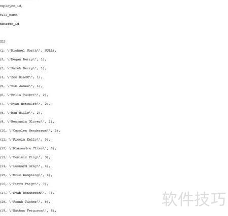 3、 员工表包含三个字段:员工编号、上级编号和姓名。其中上级编号用于标识该员工的直接主管。以下语句向员工表中插入若干示例数据,用以展示表结构及数据存储方式,便于后续查询与管理操作的实现和测试验证过程。