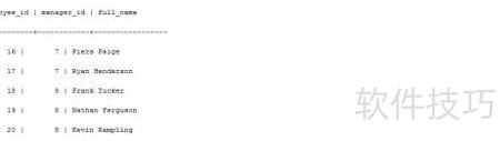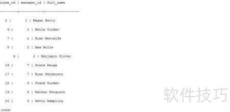 8、 第三次迭代未查到向上级为16、17、18、19、20号员工的记录,结果为空。最终结果由PostgreSQL整合非递归部分及前两次递归迭代所得数据,取其并集后返回,构成完整的查询输出内容。