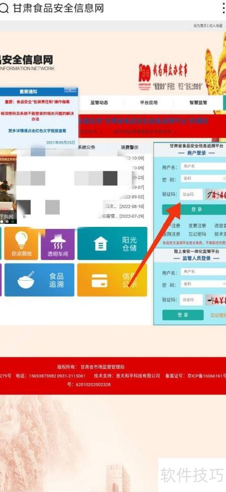 3、 访问甘肃食品安全信息网,点击登录按钮进入。