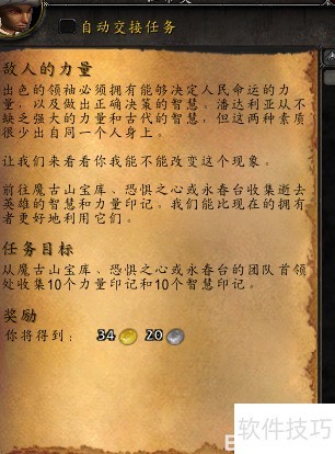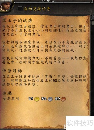 2、 接下来有两个任务需要完成:敌人的力量和黑王子的试炼。前者是收集类任务,需获取10个力量印记和10个智慧印记,这些印记在当前所有副本的BOSS中均有掉落几率,只要运气尚可,一周内即可集齐。后者则较为轻松,前往雷神岛,三小时内便可将声望提升至崇拜。邀请几位可靠伙伴一同前往,任务完成后即可获得染煞宝石。
