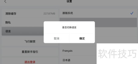 5、 在语言页面选择所需语种,点击弹出菜单中的确定按钮,即可完成语言切换。
