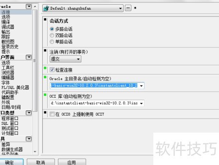 4、 进入菜单栏,依次选择工具下的首选项选项,随后切换至连接设置界面。在Oracle主目录一栏中填写路径:d:instantclient-basic-win32-10.2.0.3instantclient_10_2;在OCI库输入框中填入该目录下的oci.dll文件完整路径,即d:instantclient-basic-win32-10.2.0.3instantclient_10_2oci.dll。完成填写后,勾选检查连接选项以验证配置有效性。确认所有设置无误后点击确定保存更改。随后关闭当前PL/SQL Developer程序并重新启动,使用相应账号重新登录系统,即可应用新的连接配置,具体操作界面参考附图所示。