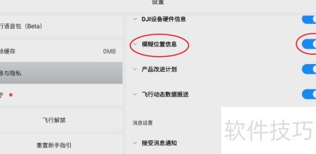 打开DJI Fly应用,进入我的选项,找到模糊位置信息并点击右侧开关即可启用。