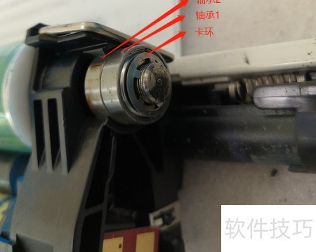 2、 用钩子勾出一侧卡环,拆下轴承1和轴承2,其中轴承2可用一字螺丝刀辅助撬出。