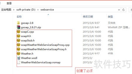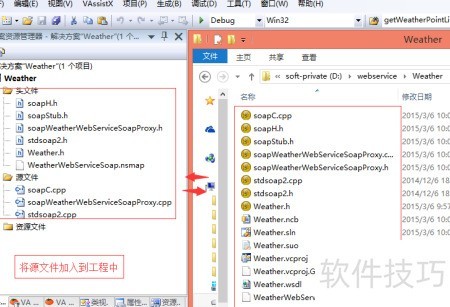 6、 将第3、4步生成的文件复制到项目目录D:webserviceWeather中,同时从gsoap文件夹内拷贝stdsoap2.h和stdsoap2.cpp两个文件至该目录。随后,将所有相关源文件添加进项目工程,确保完整包含所需组件,为后续编译与运行做好准备。