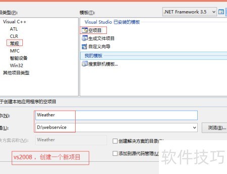 5、 启动Visual Studio 2008,创建一个新项目,并将项目保存在D盘的webserviceWeather目录中。