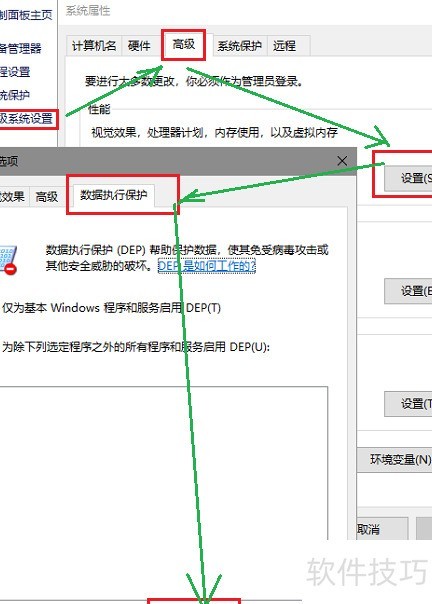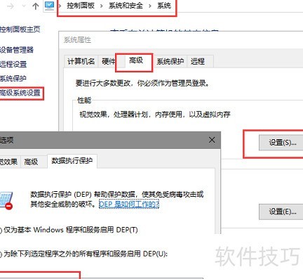 2、 分析原因后,需重新添加数据执行保护例外。先打开数据执行保护设置界面,进行相应配置操作。