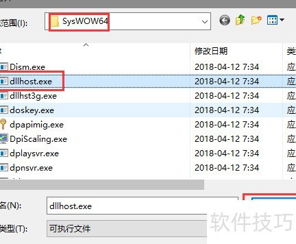 4、 点击添加按钮,从C:WindowsSysWOW64目录中选择dllhost.exe并打开。出现提示时直接确认,随后点击应用并确定即可完成操作。