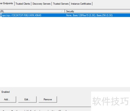 2、 在服务器端点选项卡中,先清除现有端点,然后点击添加按钮,配置新的OPC UA服务器端点,完成端点设置。