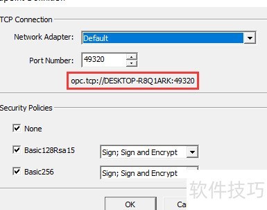 4、 系统将生成供OPC UA客户端访问的端点描述信息。若设备配备多个位于不同网段的网络适配器,需从下拉菜单中手动选择目标网卡。端口号可根据实际网络环境进行配置,通常采用默认值即可。在安全策略选项中,勾选None以取消安全策略限制,最后点击确认按钮完成设置。