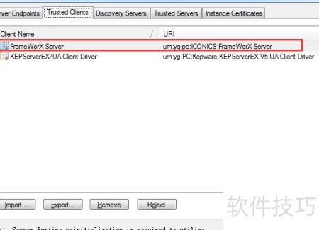 11、 当GEN64软件首次连接OPC UA服务器时,服务器需对客户端进行身份验证。此时应启动OPC UA配置管理工具。在界面中若发现红框标注的条目,通常表示该客户端尚未被信任。用户可选中该条目,随后点击底部的Trust按钮,完成对该OPC UA客户端的授信操作,使其获得访问权限。若今后希望阻止某台设备上的客户端继续连接服务器,可在列表中选中对应条目,然后点击Reject按钮,系统将拒绝其后续访问请求。一旦执行拒绝操作,该设备上的OPC UA客户端将无法再与服务器建立连接。通过这一机制,管理员能够有效控制哪些客户端可以接入服务器,从而提升系统的安全性和可控性。整个过程操作直观,便于维护网络环境中的通信安全。