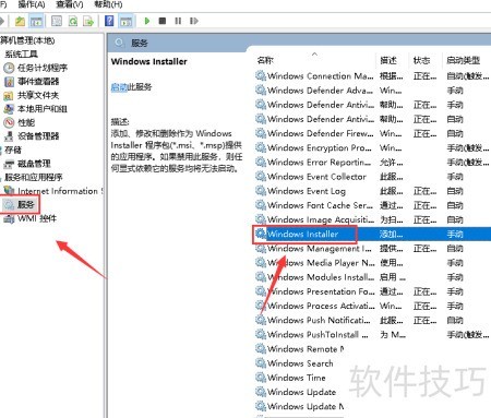 3、 展开服务列表,定位并点击Windows Installer服务选项,操作所示。