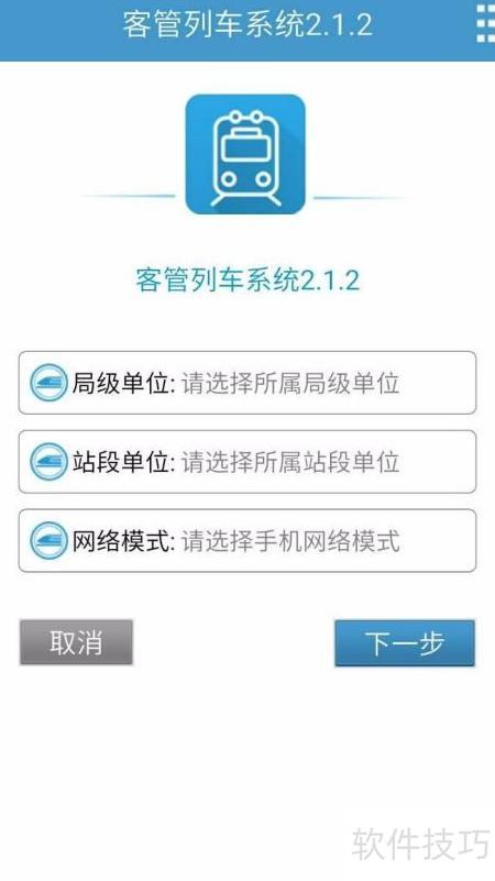 6、 请注意网络模式的选择:若使用手机3G、4G或Wi-Fi等公共网络,请选择常规互联网通道;若接入专用的站车网络,则应选择站车通道。选择站车通道后,需点击绑定客运服务系统(须预先安装该系统),然后点击下一步。当出现1004:暂无新版本提示时,点击取消,即可进入个人登录界面。