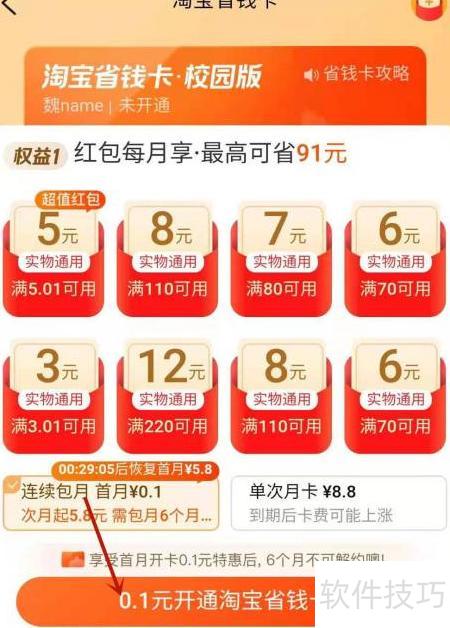 淘宝月卡红包从17.8元降至3.9元,只需开通省钱卡,操作简单,跟着步骤轻松享受优惠。