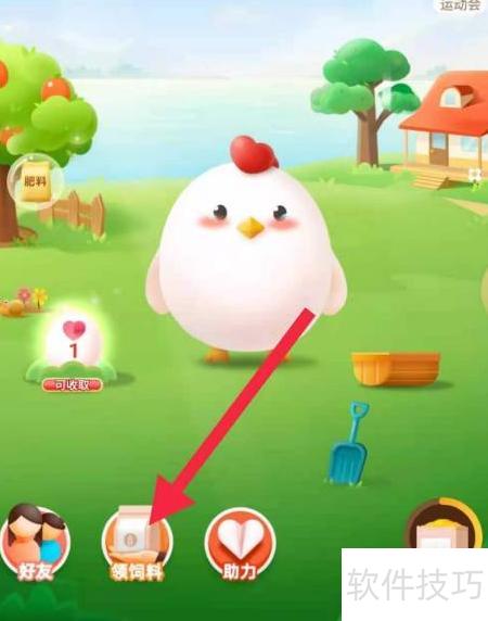 2、 进入后点击底部箭头指示的领饲料按钮。