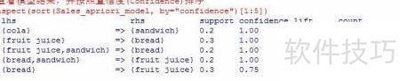 10、 查看模型输出,选取置信度最高的前五个结果,其中lift代表提升度,count代表出现次数。