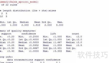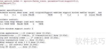 7、 在构建模型时,需调用函数apriori(data, parameter = NULL, appearance = NULL, control = NULL)。其中,data为以transactions格式组织的数据集,用于挖掘频繁项集。parameter参数用于设定算法的基本阈值,包括最小支持度(support),通常设为0.1,以及最小置信度(confidence),默认值一般为0.8,这两个指标共同决定关联规则的有效性。appearance参数可用于限定项在规则中的出现位置,例如仅出现在前件或后件中,每一项对应一种具体商品。control参数则用于调整算法的运行行为,如控制输出结果的排序方式、计算效率及显示选项等,从而优化模型执行过程。通过合理配置这些参数,能够有效提升关联规则挖掘的准确性与实用性,适用于零售、推荐系统等多个场景。