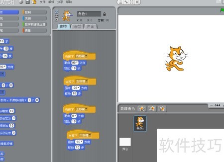 3、 将指令直接拖出即可开始编程,先编写一段通过按键控制小猫移动的程序,所示。点击右上角的绿色旗帜,小猫便能按指令行动起来。