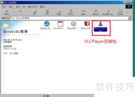 1、 找到下载的VLCPlayer安装包,在KernelEX兼容性设置中选择XP SP2模式进行运行。