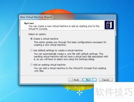 1、 打开VirtualPC,进入添加虚拟机向导,选择创建新虚拟机选项并继续操作。