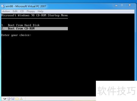 5、 启动虚拟机后,加载已下载的Windows 98系统ISO镜像文件,并在启动项中选择从光驱引导,使系统通过虚拟光盘启动安装程序。