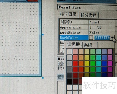 5、 在右侧属性栏找到BackColor属性,点击其右侧的下拉箭头,在弹出的调色板与系统选项中,选择调色板进行颜色设置。